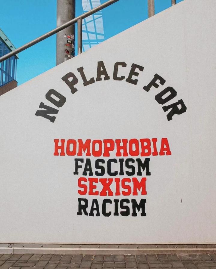 (米勒门球场看台一侧,写有“拒绝恐同、法西斯、性别歧视、种族主义”)