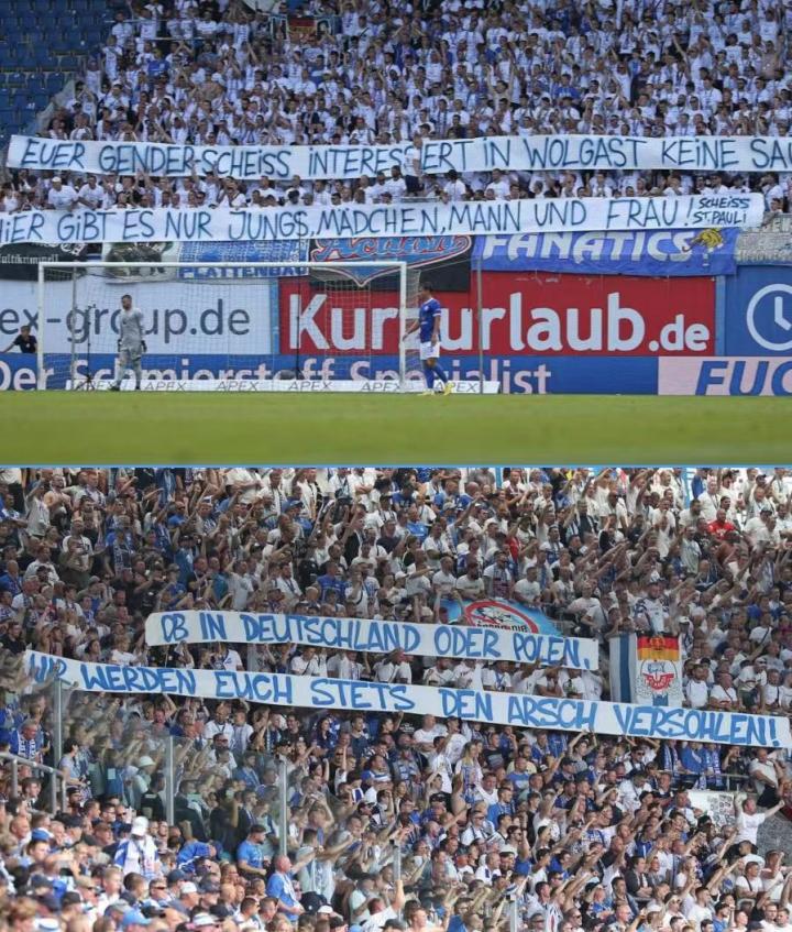 (罗斯托克球迷曾打出“这个世界上只有男人、女人、男孩和女孩”的横幅,旗帜鲜明地反对圣保利)