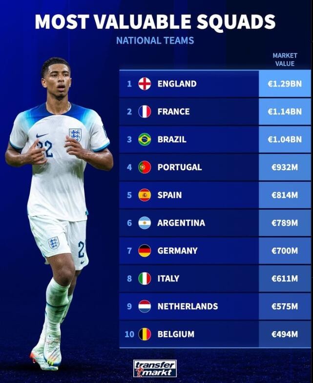 国家队阵容总身价排名:英格兰13亿欧第一,法国第二