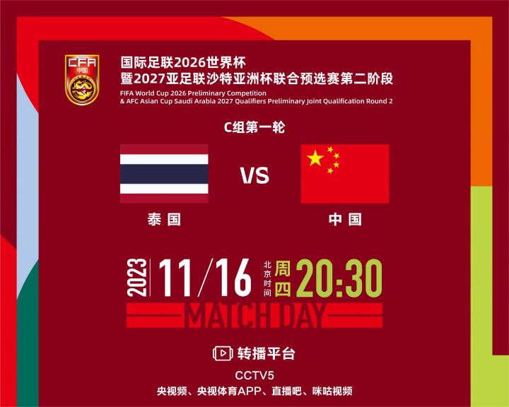 北京时间11月16日20:30,在2026美加墨世界杯亚洲区预选赛第二阶段(36强赛)第一轮中,国足将奔赴客场曼谷拉贾曼加拉体育场,对阵泰国队。赛前一天晚上,最新节目单显示,央视体育频道(CCTV5)将从16日20:00开始,聚焦直播这场关键对决。
