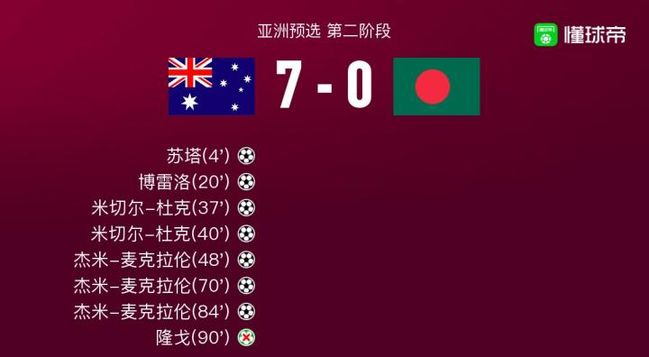 北京时间11月16日亚洲预选 第二阶段,澳大利亚主场对阵孟加拉国。澳大利亚苏塔破门,博雷洛破门,米切尔-杜克梅开二度,杰米-麦克拉伦帽子戏法。孟加拉国。最终比分7-0。