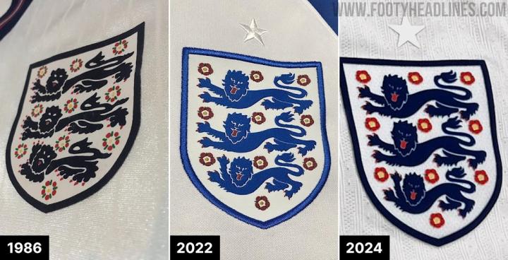 英格兰2024年球衣上的队徽中三狮的颜色将会回归...