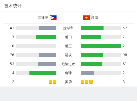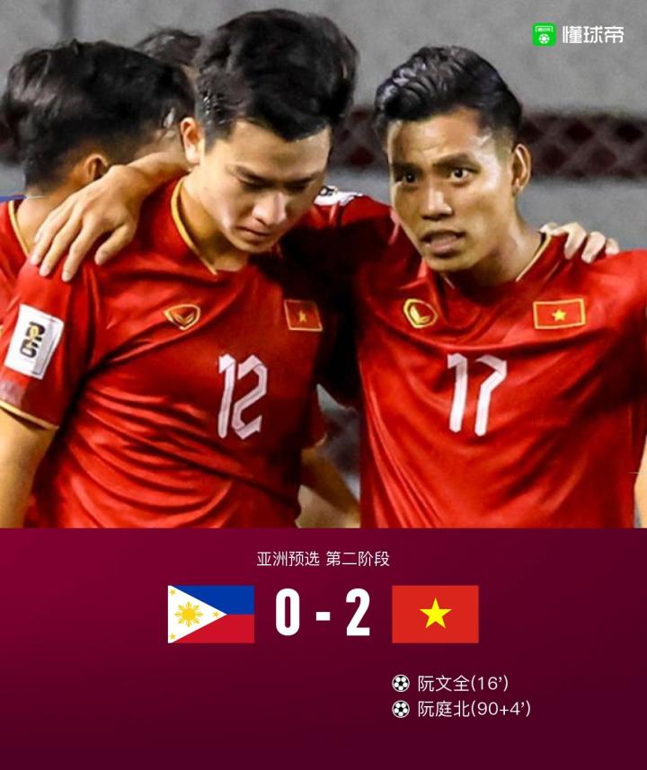 北京时间11月16日亚洲预选 第二阶段,菲律宾主场对阵越南。此役,阮文全乱战建功,阮庭北远射破门锁定胜局。最终,越南2-0客胜菲律宾。