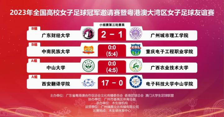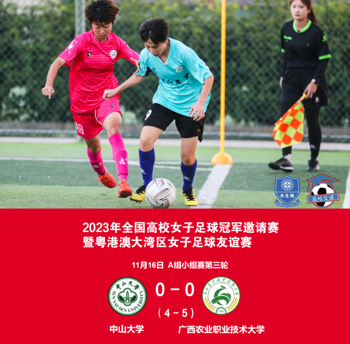 耀武酒肆工作室11月17日,2023年全国高校女子足球冠军邀请赛暨粤港澳大湾区女子足球友谊赛在广东番禺木生缘球场继续进行,广西农职大点球击败中山大学,挺进半决赛。