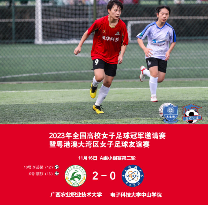 11月19日16:30,广东番禺木生缘球场,2023年全国高校女子足球冠军邀请赛暨粤港澳大湾区女子足球友谊赛半决赛,广西农职大对阵中南民族大学,广西玫瑰加油!