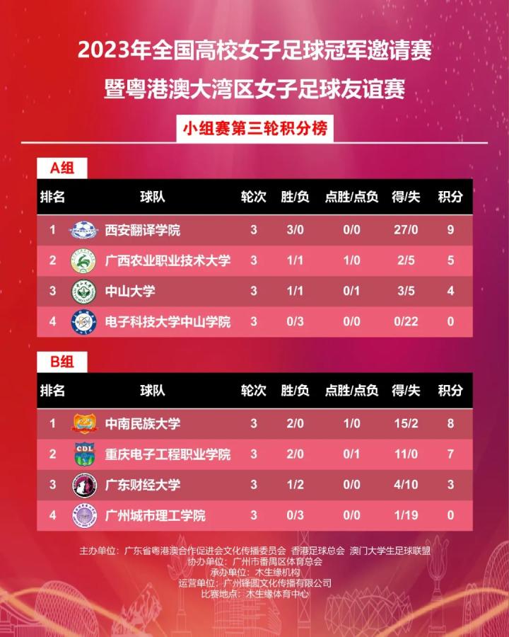 在小组赛最后一轮的其他比赛中,西安翻译学院成为唯一一支三胜满分的球队。A组方面,西安翻译学院与广西农职大携手出线,而中南民族大学和重庆电子工程职业学院则成为B组的两支晋级球队,11月18日将进行半决赛的争夺,广西农职大对阵中南民族大学,西安翻译学院对阵重庆电子工程职业学院。