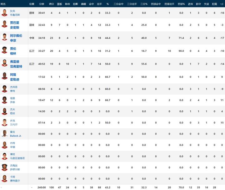 休斯顿火箭申京23分8板4助1断,杰伦-格林20分4板5助1帽,范弗利特19分8板10助1断1帽。