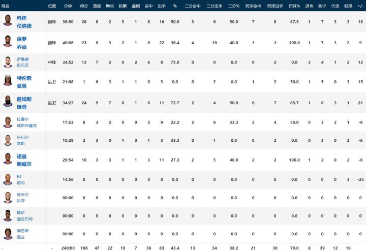 洛杉矶快船哈登24分9板7助1帽,莱昂纳德26分8板2助5断1帽,乔治23分8板3助2断1帽;