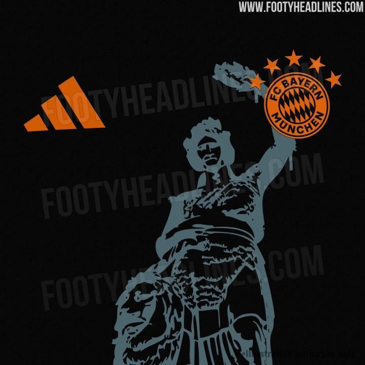 下赛季拜仁的客场球衣将会和本赛季一样都为黑色,图片中的橙色为猜测配色。但和本赛季客场球衣不同的是设计的灵感来源。24/25赛季的客场球衣是为了纪念巴伐利亚州的守护神巴伐利亚雕像而设计的。