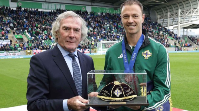 你已经为自己的国家队出场100场,达成这一里程碑感到多么自豪?从帕特-詹宁斯这样的传奇人物手中接过帽子(奖杯)是不是很高兴?