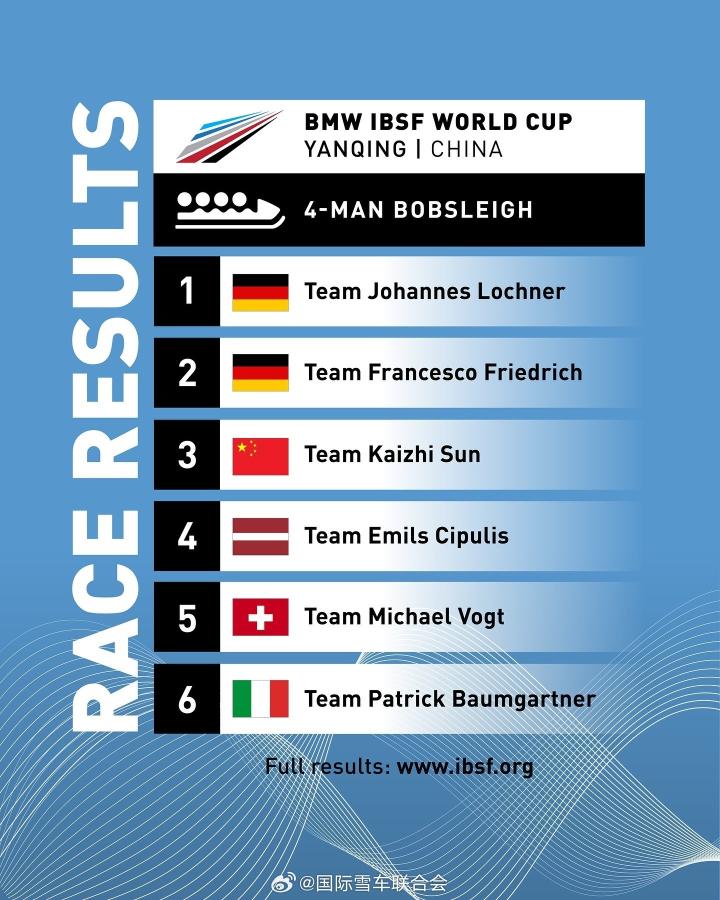 创造历史,中国四人雪车首获世界杯奖牌SergioSun @懂球帝2023-11-18 21:50在刚刚结束的IBSF(国际雪车联合会)世界杯延庆站四人雪车的比赛中,中国选手孙楷智、甄恒、丁嵩 、叶杰龙在两轮的滑行中以1分57秒44的成绩获得铜牌,这是中国男子雪车获得的首枚世界杯奖牌。图源:国际雪车联合会比赛中,冠亚军由德国舵手约翰内斯·洛赫纳与弗朗西斯科·弗里德里希车组包揽。展开更多