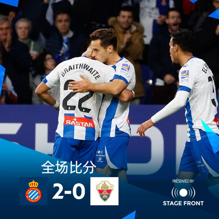 最终全场比赛结束,西班牙人2-0埃尔切。