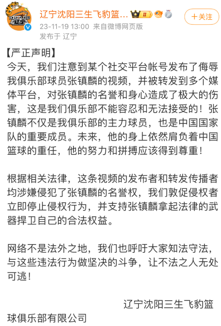 辽篮发出官方声明!全力为张镇麟撑腰,要严惩天津视频拍摄者