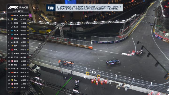 维斯塔潘在发车时将勒克莱尔逼出赛道,并且未交还位置,被罚时5秒。