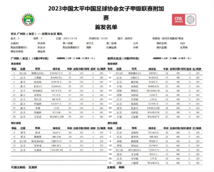 北京时间11月19日,2023年女甲联赛附加赛在苏州进行,在本赛季女甲联赛垫底的广州女足面对女乙球队北师大女足。最终北师大女足以1-0战胜广州女足,获得2024赛季女甲参赛资格,而广州女足则将在下赛季参加女乙联赛。