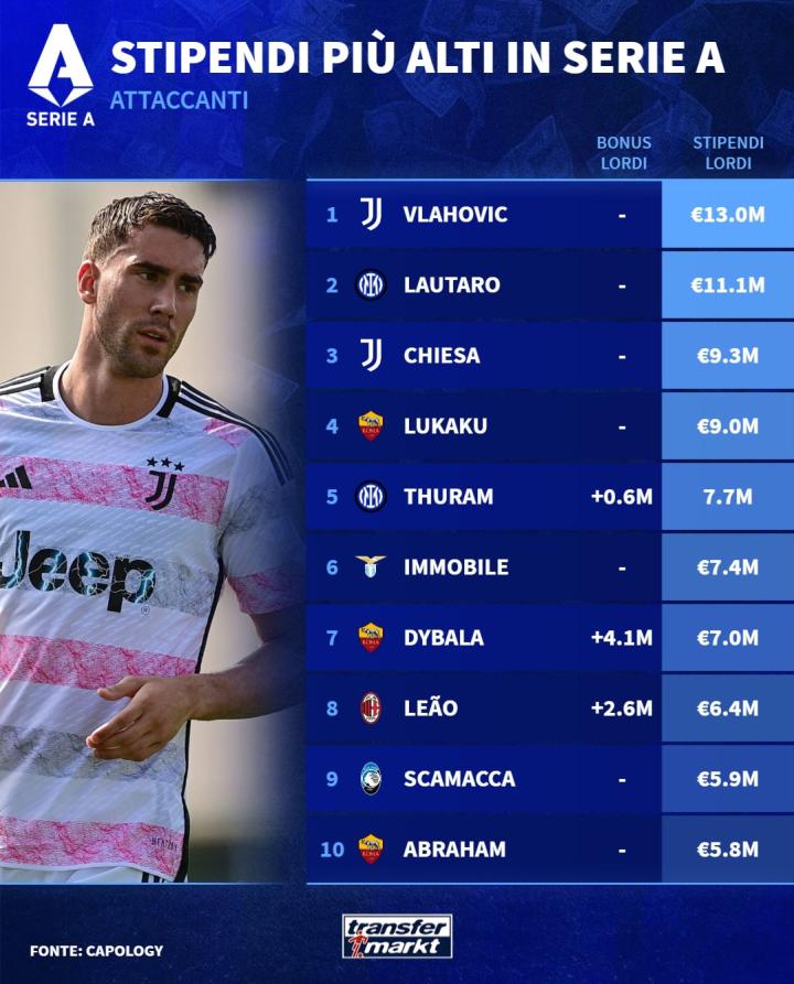 尤文图斯的弗拉霍维奇税前1300万欧元年薪拍在第一,他的队友基耶萨930万欧元排在第三。