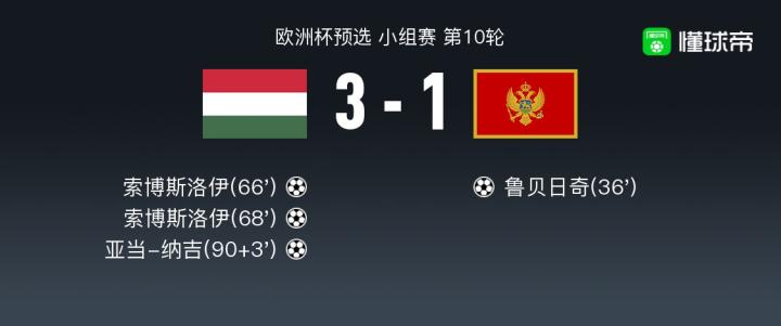 北京时间11月19日欧洲杯预选 小组赛 第10轮,匈牙利主场对阵黑山。匈牙利索博斯洛伊梅开二度,carry全场获获评10分。亚当-纳吉破门。黑山鲁贝日奇破门。最终比分3-1。