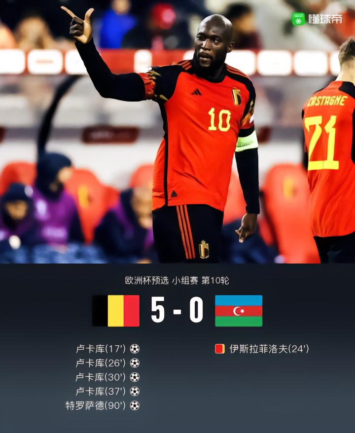 比利时5-0狂胜阿塞拜疆,卢卡库20分钟大四喜,特罗萨德建功