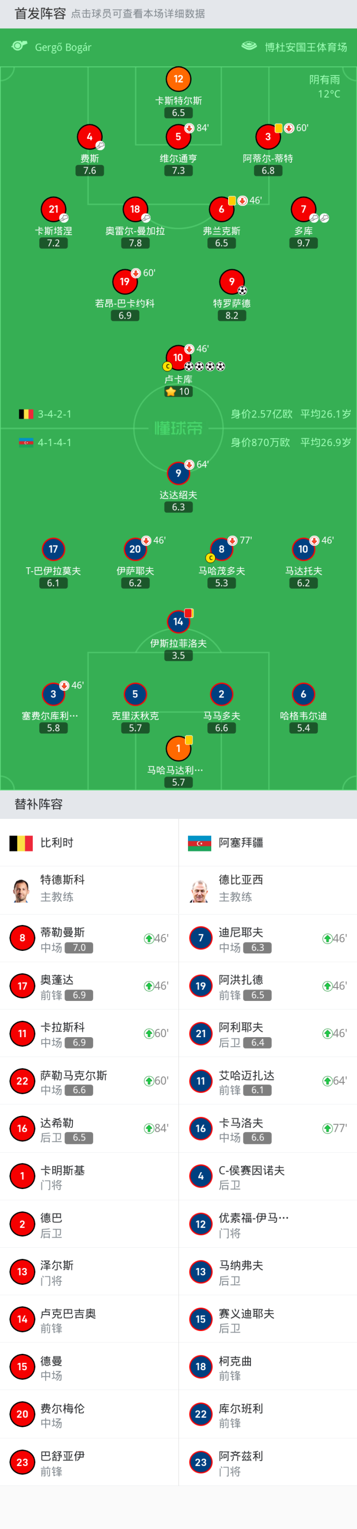 比利时首发:5-维尔通亨, 10-卢卡库, 12-卡斯特尔斯, 9-特罗萨德, 21-卡斯塔涅, 4-费斯, 18-奥雷尔-曼加拉, 7-多库, 6-弗兰克斯, 19-若昂-巴卡约科, 3-阿蒂尔-蒂特