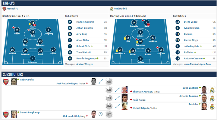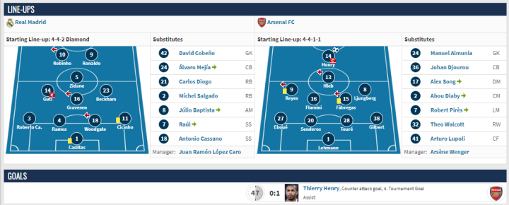 在两回合的比赛中,凭借着亨利的唯一进球,阿森纳最终淘汰了皇马,晋级8强。
