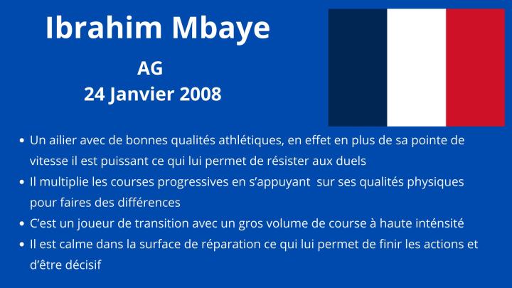 姆巴耶是一位全能攻击手,可能他的个子不算高,但是速度快,重心低且善于对抗(在更高级的比赛中对抗成功率还需检验,但应付U17绰绰有余),持球能力不俗,也有很好的配合和传射意识/能力。