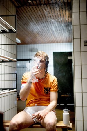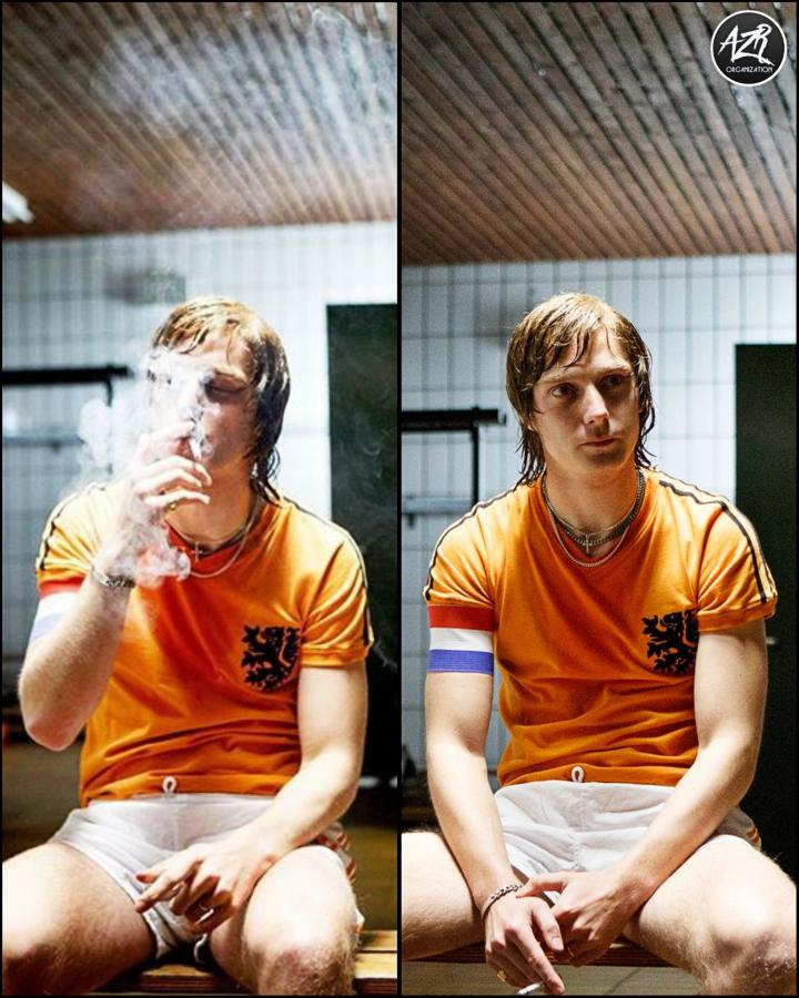 1974 年世界杯决赛中场休息时约翰·克鲁伊夫抽烟的标志性照片……完全是假的。来认识一下荷兰演员 Reinout Scholten van Aschat,他在电视剧中扮演了足球传奇人物。不要相信你所看到的一切......
