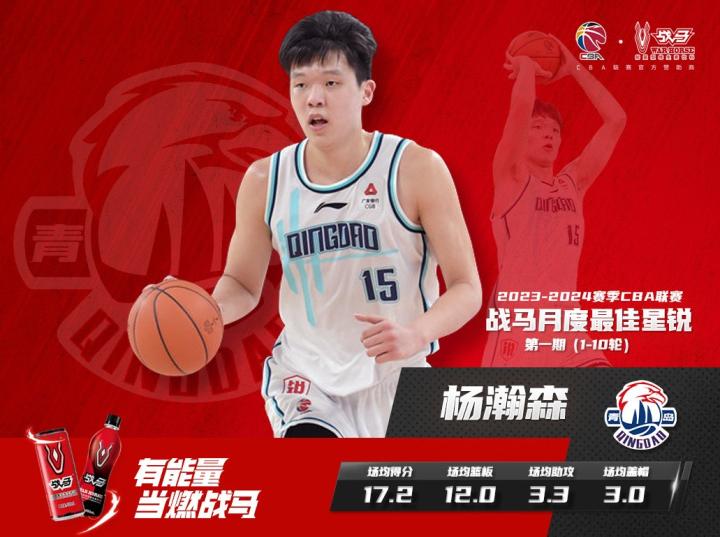 11月21日下午,CBA联赛官方发布消息,青岛男篮内线杨瀚森当选联赛首期最佳星锐球员。