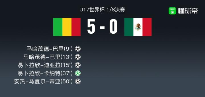 北京时间11月21日U17世界杯 1/8决赛,马里U17主场对阵墨西哥U17。马里U17马哈茂德-巴里梅开二度,易卜拉欣-迪亚拉破门,安热-马夏尔-蒂亚破门,易卜拉欣-卡纳特破门。墨西哥U17。最终比分5-0。