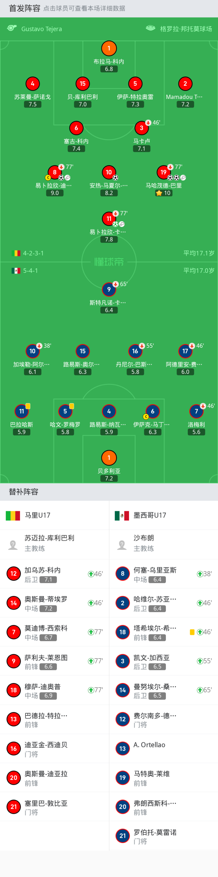 马里U17首发:2-Mamadou Traoré, 15-贝-库利巴利, 11-易卜拉欣-卡纳特, 5-伊萨-特拉奥雷, 1-布拉马-科内, 4-苏莱曼-萨诺戈, 6-塞古-科内, 8-易卜拉欣-迪亚拉, 19-马哈茂德-巴里, 10-安热-马夏尔-蒂亚, 3-马卡卢