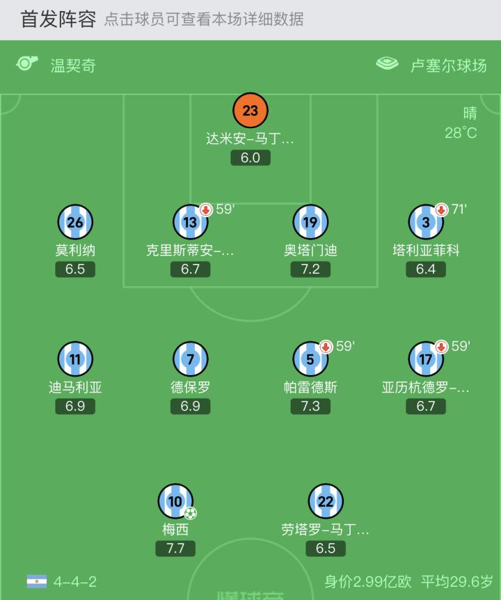 前锋:梅西、劳塔罗、迪马利亚、阿尔瓦雷斯、迪巴拉、天使·科雷亚、阿尔马达