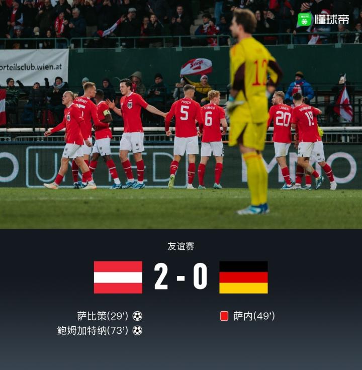 【德国0-2客负奥地利,萨内染红,萨比策破门,鲍姆加特纳传射】