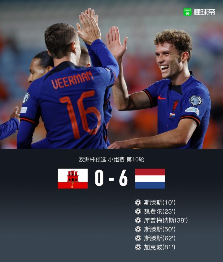 【荷兰6-0轻取直布罗陀,斯滕斯戴帽,加克波破门,马伦献助攻】