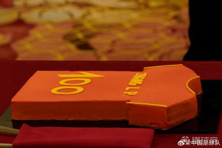 比赛日的当天中午,国家队内部为张琳芃举行了一个小型庆祝仪式。一个精心制作成国家队球衣形状的蛋糕上,醒目地写着张琳芃的名字和“100”字样。
