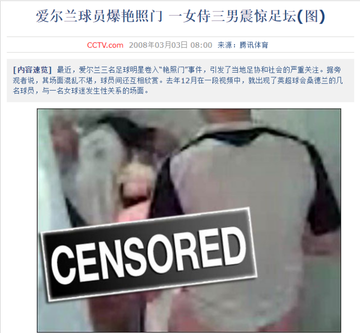 到了2007年12月,爱尔兰足坛爆出一起丑闻。3名球员录下了与一名女子寻欢的视频,并大胆上传到youtube,尽管20分钟后就被删除,但依然被多人迅速录下及下载。