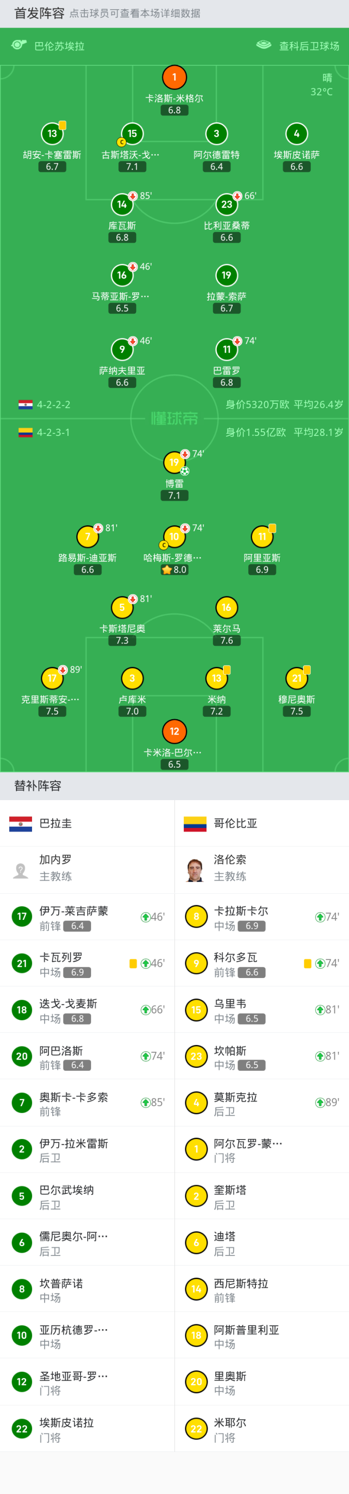 替换下场:74'10-哈梅斯-罗德里格斯, 74'19-博雷, 89'17-克里斯蒂安-博尔哈, 81'7-路易斯-迪亚斯, 81'5-卡斯塔尼奥