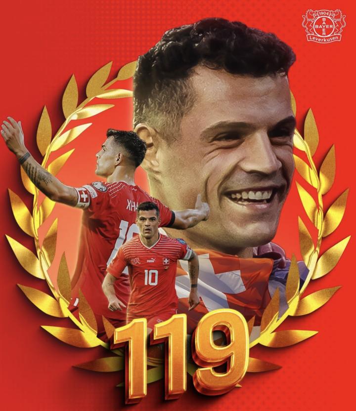 前阿森纳球员,勒沃库森中场大将扎卡完成了国家队的119次出场! 瑞士传奇!