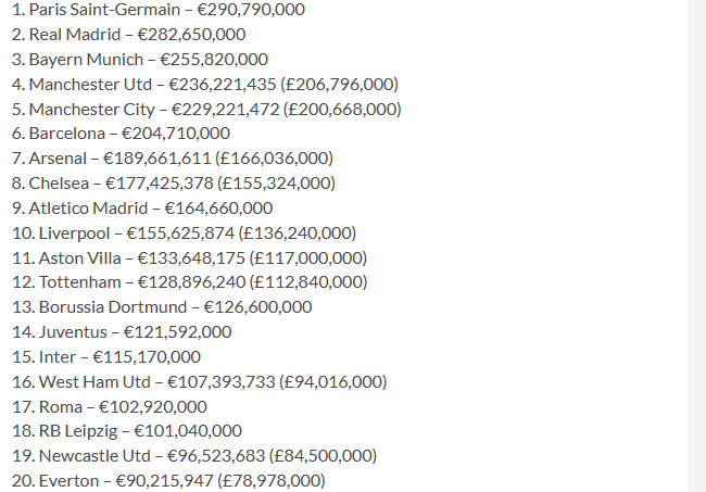 1. 巴黎圣日耳曼 – 290,790,000 欧元