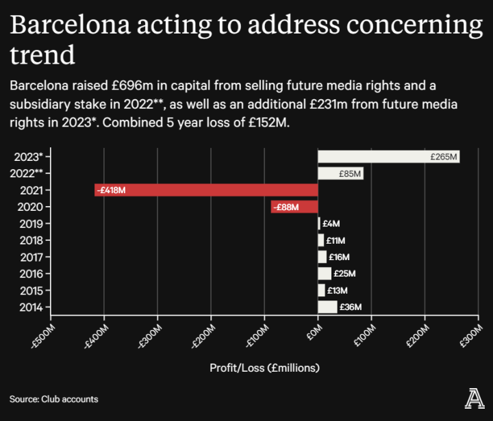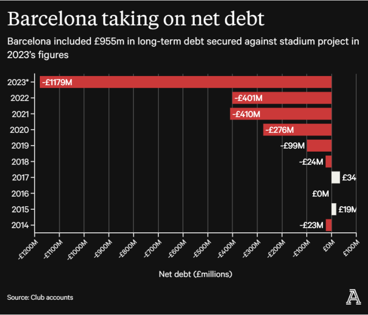 所有这些奇特财务手段的结果是2022-23财年“丰厚的利润”,拿到了一个西甲联赛冠军,媒体收入减少,俱乐部的净债务增加了近三倍,达到近12亿英镑,是欧洲足球史上最高的。