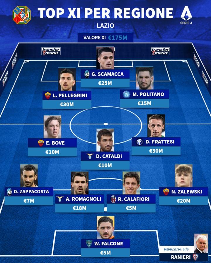 拉齐奥出生的身价最高球员阵容,佩莱格里尼、弗拉泰西领衔 飞翔的蓝鹰 飞翔的蓝鹰2023-11-25 02:10转会市场网站评出了在拉齐奥出生的现役球员最佳阵容(4/3/2/1阵型),罗马队有3人,拉齐奥队2人、亚特兰大队2人进入榜单。阵容里身价最高的是罗马队长佩莱格里尼和国米中场弗拉泰西。前锋:洛伦佐-佩莱格里尼、斯卡马卡、波利塔诺中场:博韦、卡塔尔迪、弗拉泰西后卫:扎帕科斯塔、罗马尼奥利、卡拉菲奥里、扎莱夫斯基门将:法尔科内展开更多