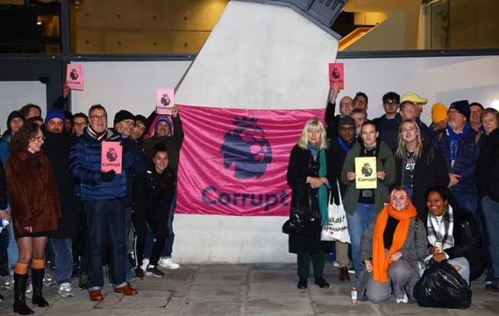 周五晚上,一群埃弗顿球迷手持一面旗帜来到伦敦帕丁顿英超总部门口,旗帜上印有英超联赛的logo,上面写着:“腐败”。