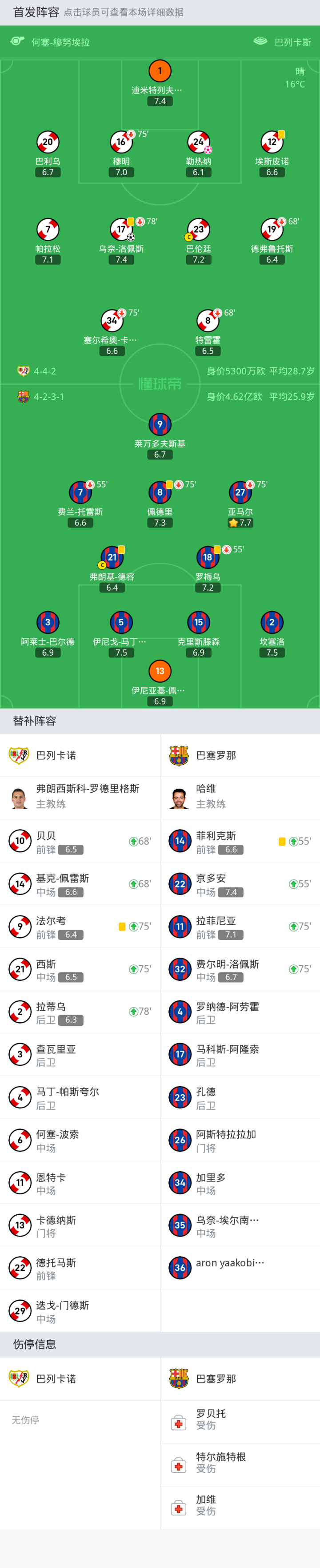 巴列卡诺首发:8-特雷霍, 24-勒热纳, 1-迪米特列夫斯基, 20-巴利乌, 17-乌奈-洛佩斯, 12-埃斯皮诺, 23-巴伦廷, 7-帕拉松, 16-穆明, 19-德弗鲁托斯, 34-塞尔希奥-卡梅略
