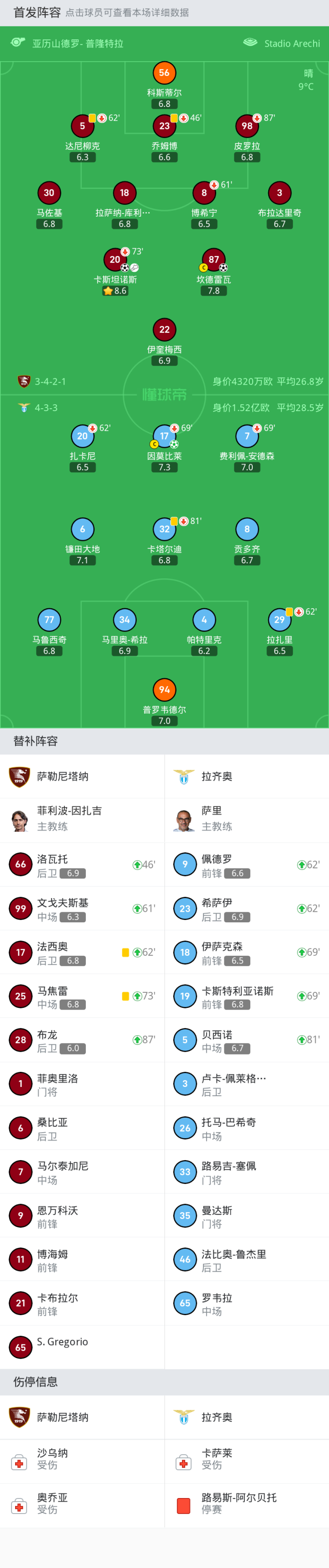 拉齐奥首发:17-因莫比莱, 7-费利佩-安德森, 4-帕特里克, 29-拉扎里, 77-马鲁西奇, 20-扎卡尼, 94-普罗韦德尔, 32-卡塔尔迪, 6-镰田大地, 8-贡多齐, 34-马里奥-希拉