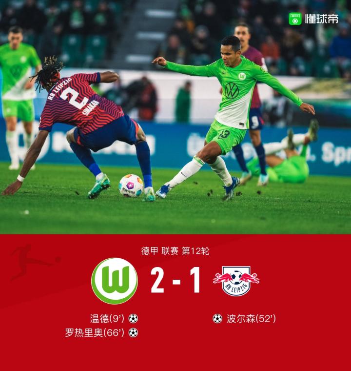 沃尔夫斯堡2-1RB莱比锡,罗热里奥破门,温德建功