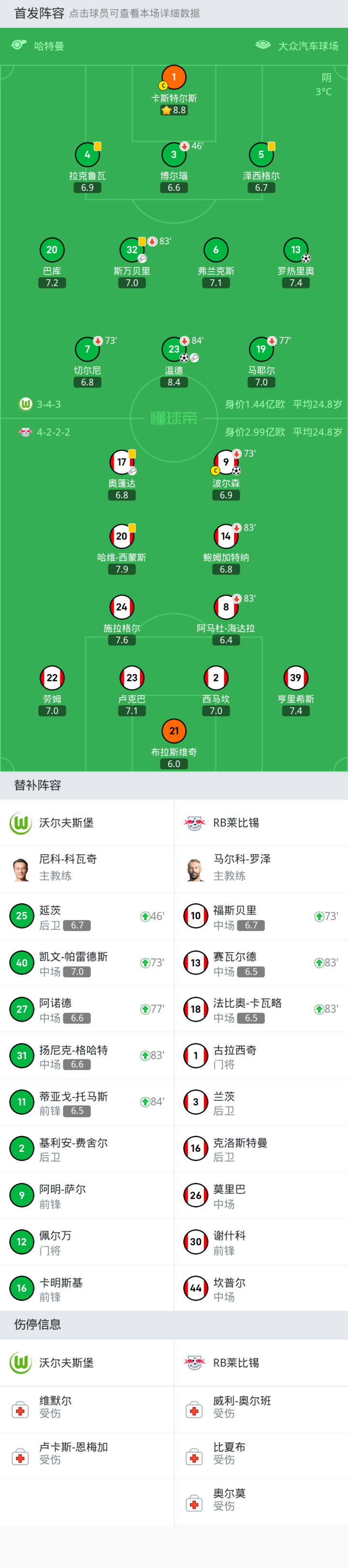 沃尔夫斯堡首发:1-卡斯特尔斯, 7-切尔尼, 32-斯万贝里, 5-泽西格尔, 3-博尔瑙, 13-罗热里奥, 19-马耶尔, 4-拉克鲁瓦, 20-巴库, 23-温德, 6-弗兰克斯