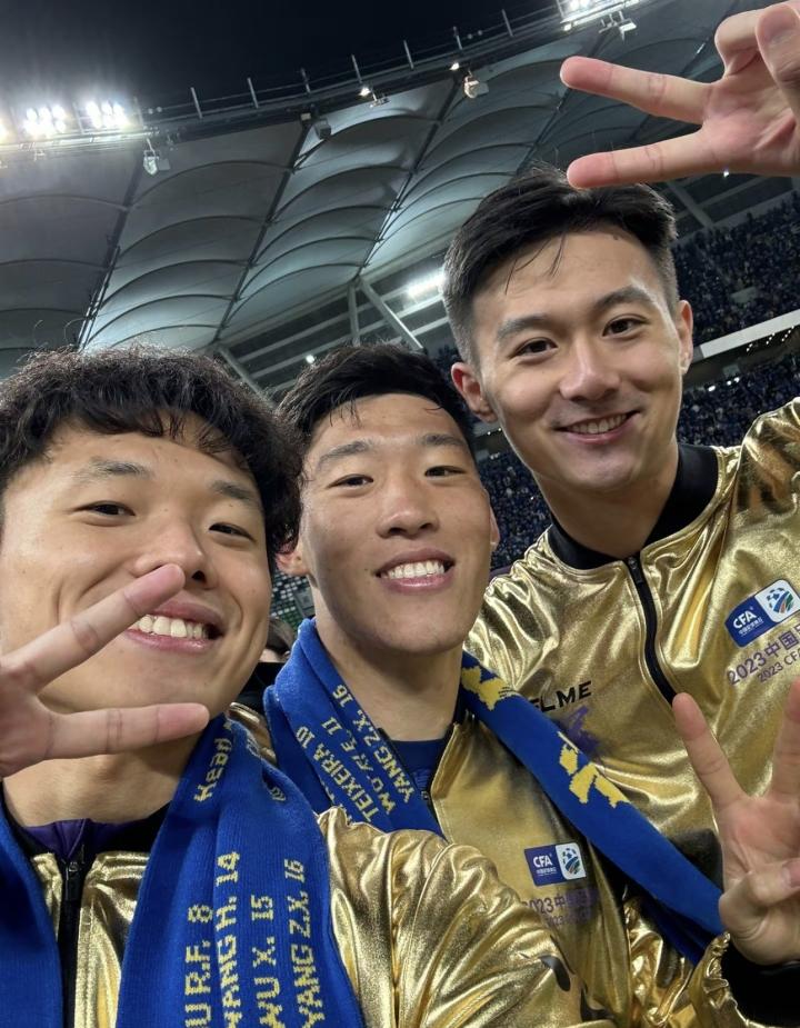 上海申花1-0战胜山东泰山,队史第四次夺得足协杯冠军。申花队员汪海健晒照庆祝:申花是冠军!