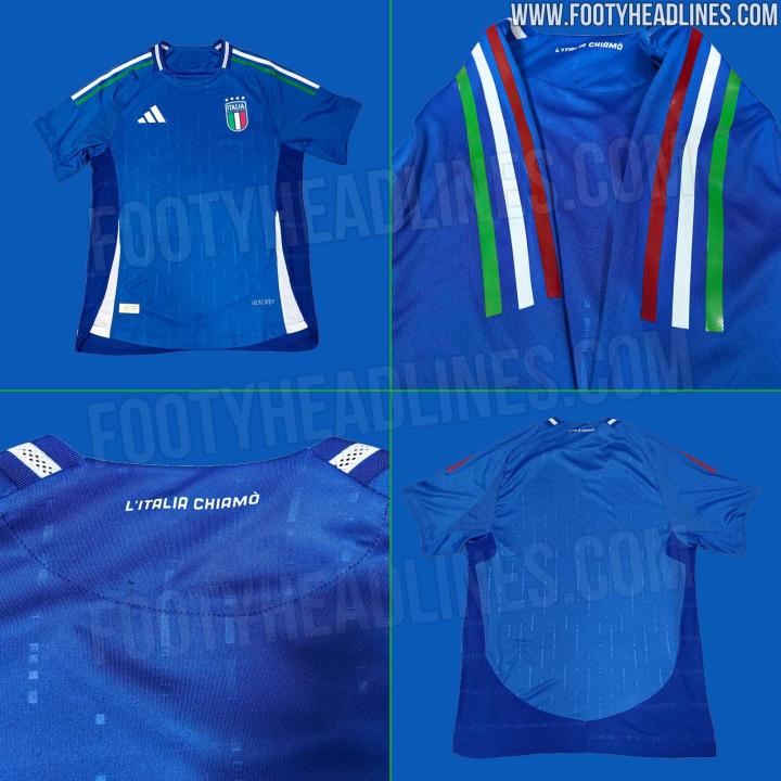近日,足球装备网Footy Headlines更新了意大利2024年欧洲杯球衣的实物图。其中最有特色的设计是赞助商阿迪达斯将自己的经典三道杠用意大利国旗的颜色来装点。