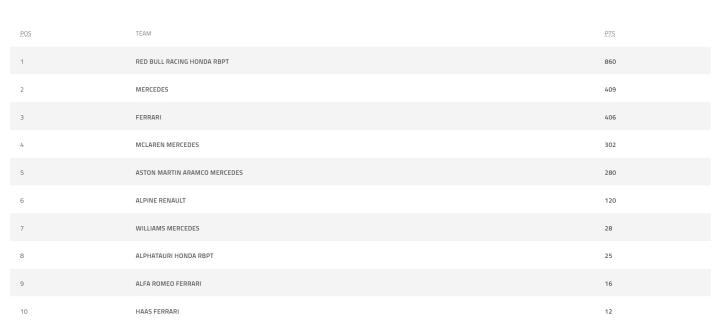 维斯塔潘的队友佩雷兹获得年度车手亚军,梅赛德斯车队汉密尔顿获得第三名。