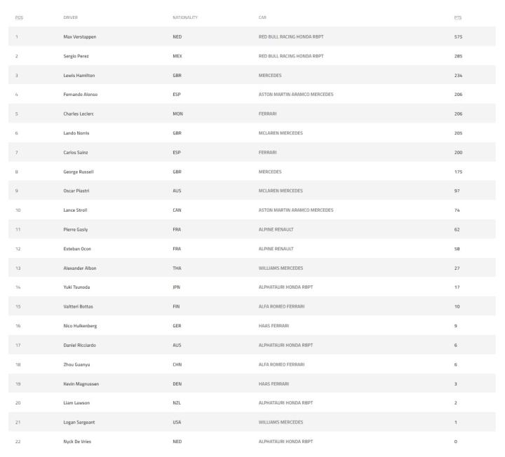 在全部22站分站赛中,维斯塔潘拿到了其中的19个正赛冠军和12个排位赛杆位,在所有车手中属于断层存在,最终早在倒数第6站卡塔尔站冲刺赛后就锁定了年度总冠军,成功实现3连冠。