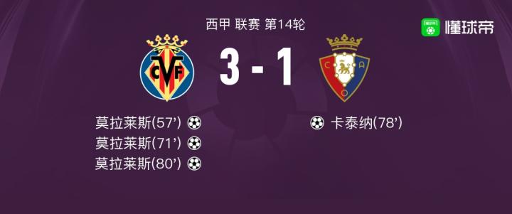 北京时间11月26日比利亚雷亚尔vs奥萨苏纳,莫拉莱斯得到全场最高的9.3分,塞尔希奥-埃雷拉得到全场最低的6.0分