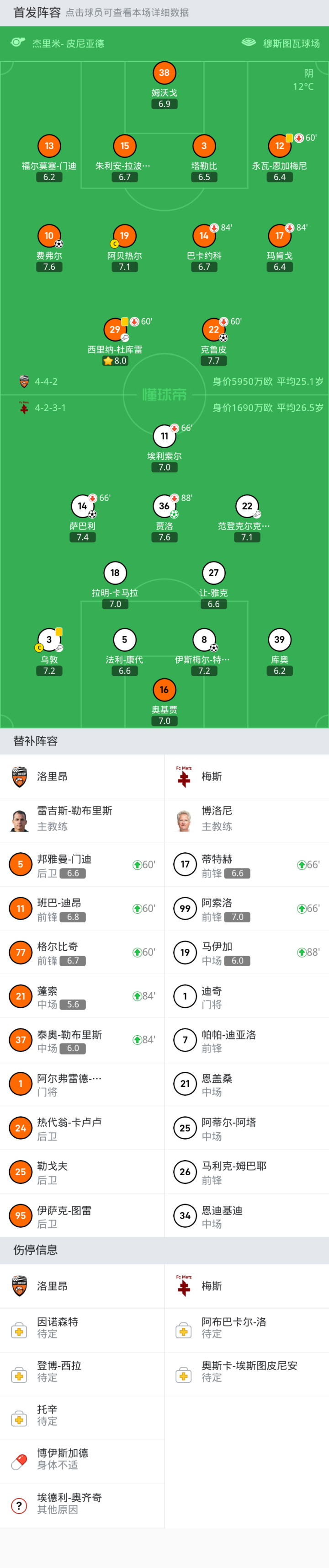 梅斯首发:8-伊斯梅尔-特拉奥雷, 16-奥基贾, 3-乌敦, 22-范登克尔克霍夫, 39-库奥, 36-贾洛, 5-法利-康代, 14-萨巴利, 11-埃利索尔, 27-让-雅克, 18-拉明-卡马拉